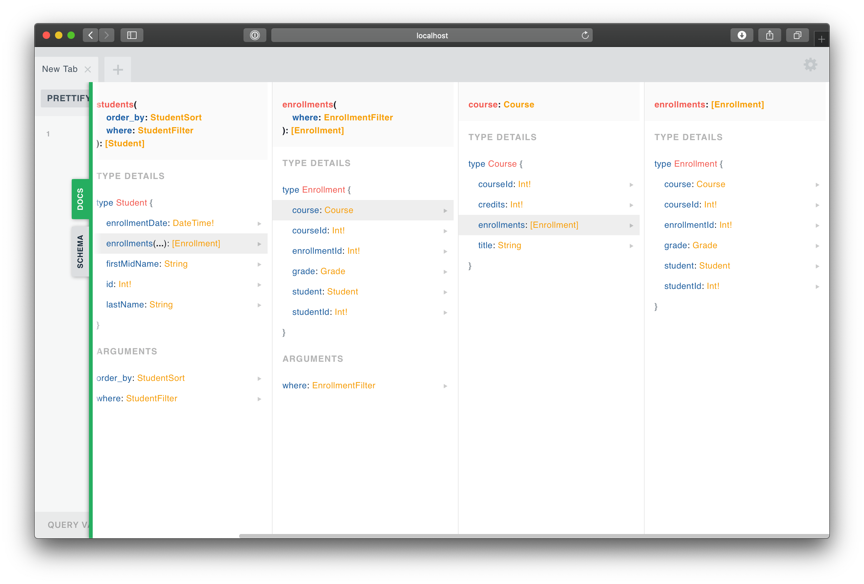 Now let us inspect our schema again. When we look at the students field we can see that there are new arguments called where and orderBy.
