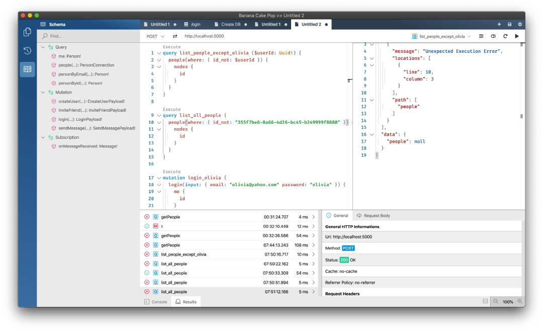 In order to now query our GraphQL server we need a GraphQL IDE to formulate queries and explore the schema. If you want a deluxe GraphQL IDE as an application, you can get our very own Banana Cake Pop which can be downloaded here.